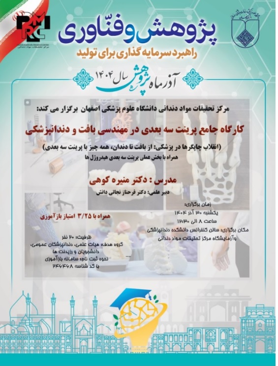کارگاه جامع " پرینت سه بعدی در مهندس بافت و دندانپزشکی" با سخنرانی سرکار خانم دکتر منیره کوهی هیات علمی محترم مرکز تحقیقات مواد دندانی همزمان با آذرماه پژوهش ۱۴۰۴، در روز یکشنبه ۳۰ آذر برگزار گردید.